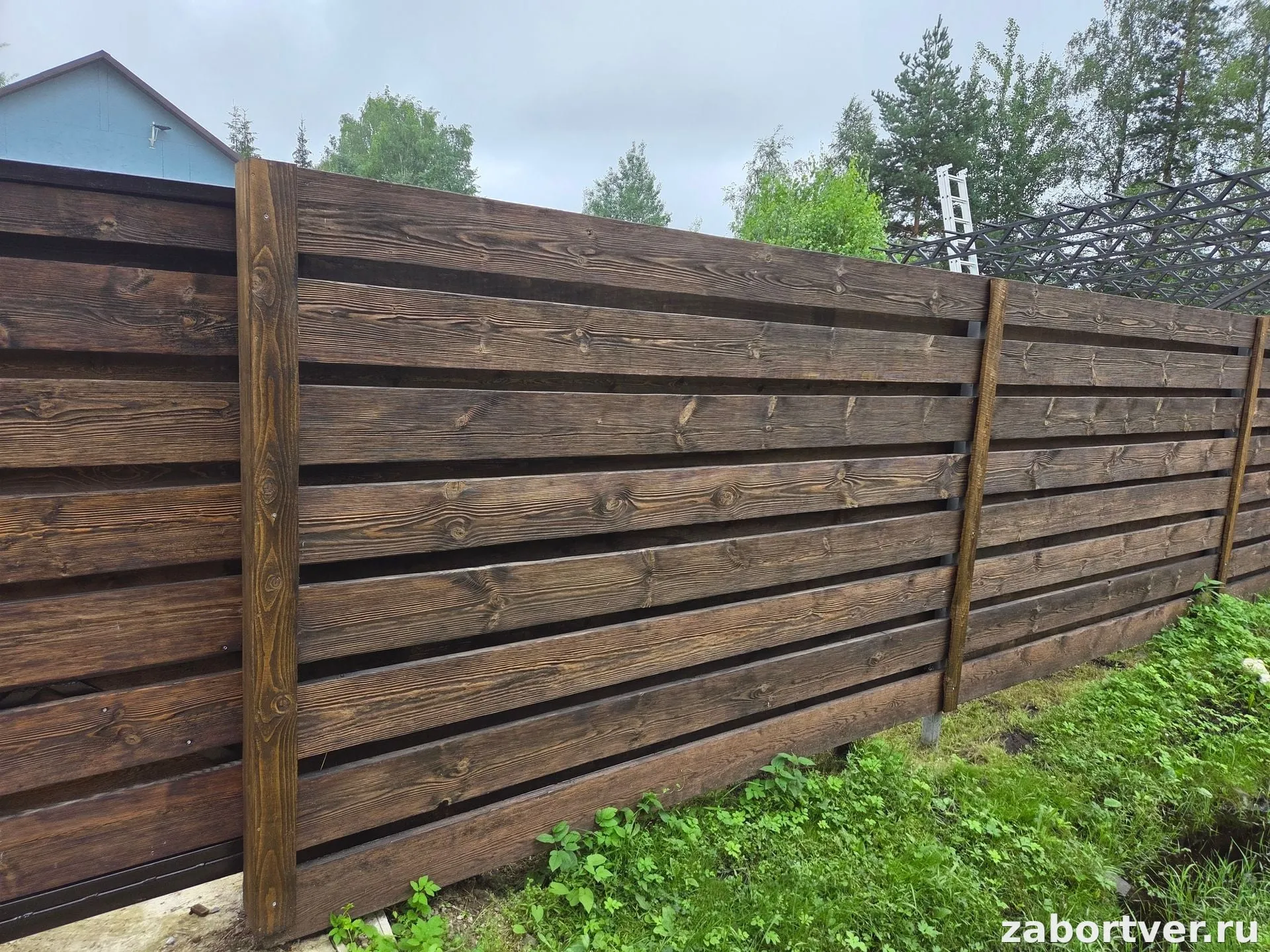Наша команда "ЗаборТверь" завершила установку стильного и надежного глухого ограждения в одном из коттеджных поселков Московской области. Мы использовали высококачественную древесину, обработанную специальными составами для придания ей глубокого тёмно-коричневого, почти шоколадного цвета с выразительной, брашированной текстурой. Такой горизонтальный забор не только обеспечивает максимальную приватность, но и служит современным архитектурным акцентом. Конструкция выполнена с небольшими, равномерными зазорами между досками для минимальной парусности и лучшей вентиляции материала, что критически важно для долговечности деревянных конструкций в условиях переменчивого климата. Все элементы прошли обязательную антисептическую и защитную обработку, что гарантирует устойчивость к влаге, УФ-излучению и биопоражению. Этот забор прослужит десятилетиями, сохраняя свой насыщенный цвет и первозданную эстетику. Клиент выбрал современное и респектабельное решение, которое идеально вписалось в ландшафт. Если вы цените натуральность, надежность и безупречный внешний вид, горизонтальный деревянный забор от "ЗаборТверь" – это инвестиция в комфорт и безопасность вашего участка.