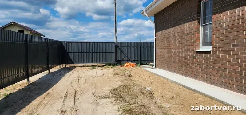 Специалистами компании «ЗаборТверь» реализован проект по установке глухого ограждения из металлического профилированного листа в популярном оттенке «Графит» (темно-серый антрацит). Этот цвет не только выглядит стильно и строго, подчеркивая современную архитектуру участка, но и отлично гармонирует с природным ландшафтом. Сплошная конструкция обеспечивает владельцам полную приватность, надежно защищая территорию от пыли, ветра и посторонних взглядов. Особое внимание уделено надежности конструкции. Каркас забора состоит из профильных металлических труб: опорные столбы 60х60 мм и две горизонтальные лаги 40х20 мм, окрашенные в цвет полотна для эстетической целостности и защиты от коррозии. Для придания завершенного вида и дополнительной жесткости верхняя кромка листа закрыта декоративной П-образной планкой. Такое решение предотвращает деформацию металла и травматизм острую кромку. Монтаж производился с учетом особенностей грунта: столбы были надежно забетонированы (или забутованы, в зависимости от ТЗ), что гарантирует устойчивость забора к сезонным подвижкам почвы и ветровым нагрузкам. Используемый профнастил имеет качественное полимерное покрытие, устойчивое к выцветанию и осадкам, что обеспечивает конструкции долгий срок службы без необходимости ежегодной покраски.