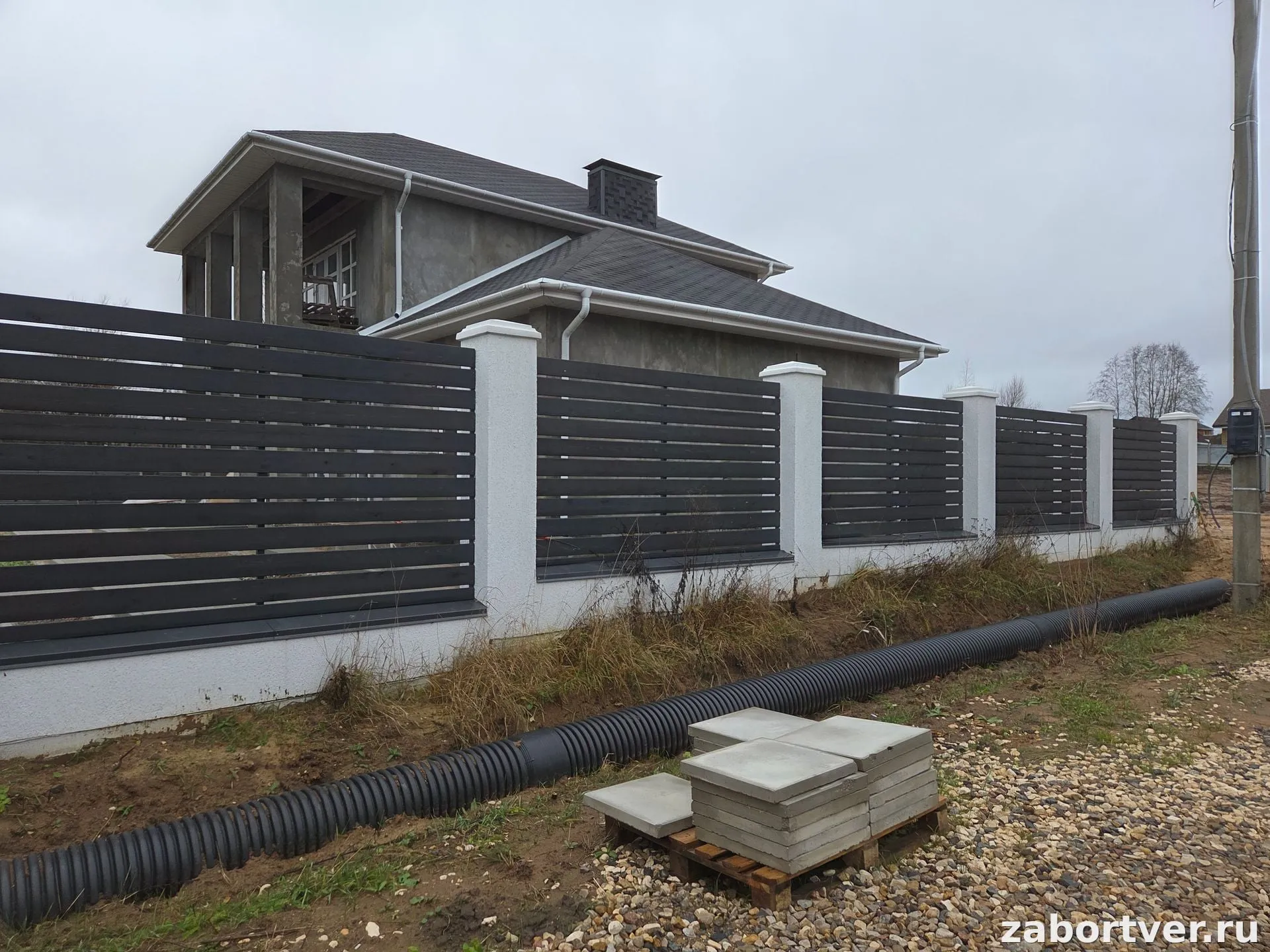 Современный забор-жалюзи с текстурой темного дерева на бетонном цоколе