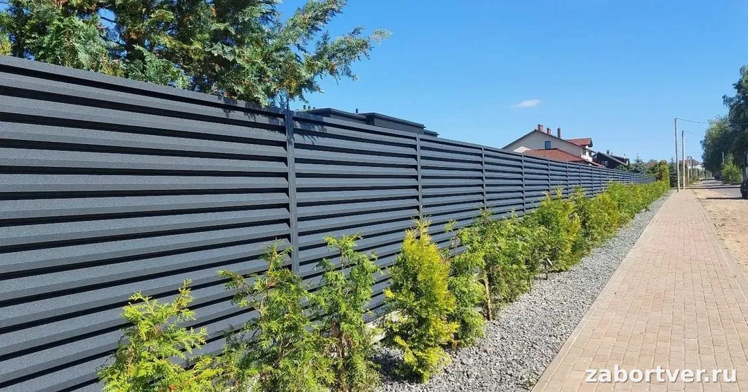 Командой «ЗаборТверь» реализован проект по установке стильного металлического ограждения жалюзийного типа. Конструкция выполнена в трендовом цвете RAL 7024 (Серый графит), который придает участку строгий и презентабельный вид. Ключевая особенность профиля «Жалюзи» заключается в уникальном расположении горизонтальных ламелей: они обеспечивают полную приватность, скрывая территорию от посторонних глаз, но при этом сохраняют продуваемость участка, исключая эффект парусности и застой влаги у грунта. В качестве материала использована высококачественная оцинкованная сталь с прочным полимерным покрытием. Это гарантирует максимальную стойкость к коррозии, ультрафиолету и механическим повреждениям. В едином ансамбле с заборными секциями смонтирована надежная калитка с современной фурнитурой, обеспечивающая удобный доступ. Такое решение не требует регулярного обслуживания и сохраняет эстетику нового изделия на протяжении десятков лет.