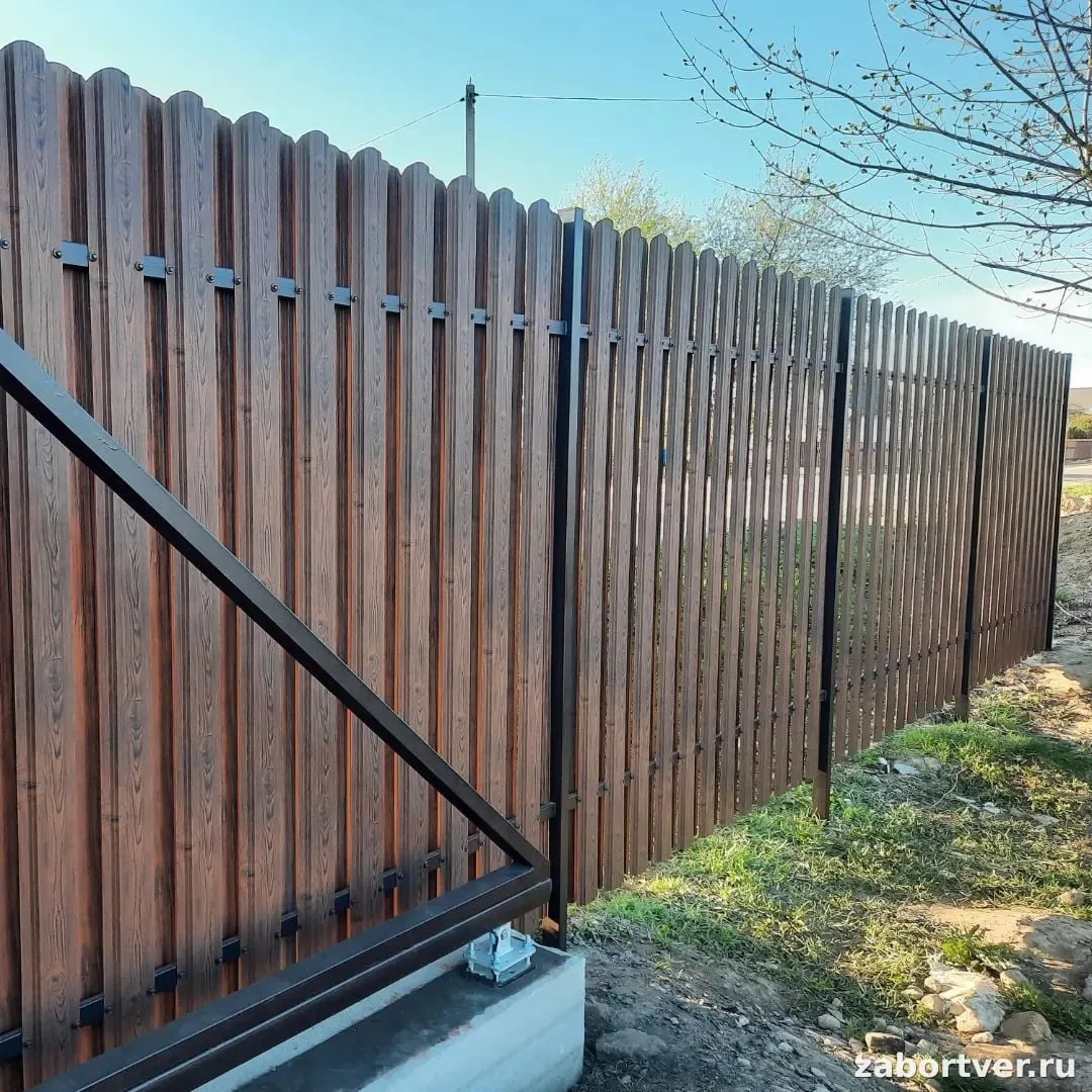 Перед вами пример надёжного и эстетически привлекательного ограждения, установленного нами для частного домовладения. Выбор пал на металлический забор, имитирующий классический штакетник, но выполненный из прочных оцинкованных ламелей. Такой материал, в отличие от деревянного аналога, не требует регулярной покраски и обработки, обеспечивая долговечность и сохранение насыщенного темно-коричневого (можно назвать «Темный шоколад» или вишня) цвета на протяжении десятилетий, даже в условиях переменчивой погоды Тверской области. Конструкция выполнена по принципу сплошного заполнения: ламели монтируются встык, обеспечивая полную приватность территории. Врезка в полотно забора аккуратной распашной калитки, выполненной из того же профиля, гарантирует единство стиля и удобство доступа. Мы уделяем особое внимание качеству монтажа опорных столбов и надежности сварных соединений, что позволяет нашему забору выдерживать значительные ветровые нагрузки. Это решение идеально подходит для тех, кто ценит сочетание безопасности, приватности и современного внешнего вида. Забор из металлического штакетника — это инвестиция в спокойствие и красоту вашего участка, которая будет радовать глаз долгие годы без лишних хлопот по уходу.